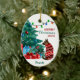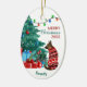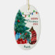 An der Vorderseite dieses Holiday-Ornament steht ein Bild eines deutschen Schäferhundes, der in einem rot-weißen Winterzeitpulli gekleidet ist. Der Hund blickt auf einen geschmückten Weihnachtsbaum mit Geschenkpackungen daneben. Eine Reihe von Lichtern ist überladen. Ihr benutzerdefinierter Text ist in 4 leicht zu ändernden Feldern unterteilt. Die Rückseite des Ornaments hat das gleiche Bild mit zwei weiteren Textfeldern. Zurzeit steht auf der Rückseite "Happy New Year".