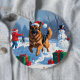Ein treuer deutscher Schäferhund läuft durch die schneebedeckte Winterlandschaft und trägt einen festlichen roten Weihnachtshut. Dieses kühne Design unterstreicht die Kraft, Intelligenz und Schutzart der Rasse und erweckt gleichzeitig die Wärme und Freude der Urlaubssaison. Ein kraftvoller Wintermoment voller festlichen Charme.