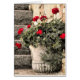 Eine große Steinvase war mit Geranien gefüllt und auf einem Flug von Außentreppen platziert.