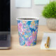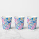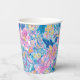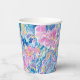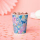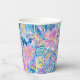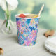 Schöne Papierbecher mit lebendiger tropischer Blütenpracht in rosa und violett mit leuchtend gelben Akzenten, überlagert von wirbelnden teal- und blauen Paisley-Formen für ein reiches, energiegeladenes, insel-inspiriertes Design. Perfekt für Geburtstage, Hochzeiten, Jahrestage, Brautduschen und mehr.