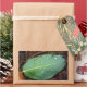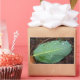 Ein einsames grünes Blatt sitzt auf der Mulche, mit Tau-Tropfen bedeckt. Schicken Sie noch heute jemandem eine natürliche Ruhe!
