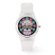 Der Zuckerschädel Dia de los Muertos (Tag der Toten) ist von bunten Blume umgeben.