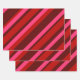 Ein Set aus drei dekorativen Verpackungspapierblättern mit einem Muster aus diagonal hellrosa, herzzermahlenen und tiefbordeauxroten Streifen