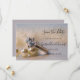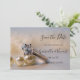 Set mit der eleganten Diamond Rings and Pearls Wedding Save the Date Announcement Card einen edlen Ton für Ihre Hochzeitsfeier. Dieses hübsche, individuelle Nuptial behalte die Datumsanzeige mit einem nahen Foto eines runden Diamant Verlobung Ring und einer weißen Perlenhalskette und einem verschwommenen hellgrauen Hintergrund.