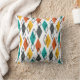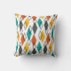 Dieses Kissen hat ein modernes Design von Diamanten in orange, gelb, türkis, grau und in einem weißen Feld verstreut umrissen.