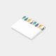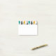Dieses Post-It Notizblock hat ein modernes Design von Diamanten in orange, gelb, türkis, grau, und umrissen auf einem Feld von Weiß verteilt.