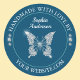 Personalisieren Sie diesen Diamantenschmetterling "Handmade with Liebe" Aufkleber mit Ihrem Namen und Ihrer Website auf ozeanblauem Hintergrund und Kreisgestaltung mit weißem Text. Klicken Sie auf "Bearbeiten mit dem Entwurfstool", um die Farben zu ändern und Stile einzugeben.