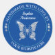 Personalisieren Sie diesen Diamantenschmetterling "Handmade with Liebe" Aufkleber mit Ihrem Namen und Ihrer Website auf tiefblauem Hintergrund und Kreisdesign mit weißem Text. Klicken Sie auf "Bearbeiten mit dem Entwurfstool", um die Farben zu ändern und Stile einzugeben.