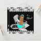 Aquamarine, blaue und schwarze, ethnisch kleine Dame Duscheinladung mit einem hübschen Baby-Mädchen, das einen fein aquamarinen blauen Tutu trägt, und Perlen, die auf einem Paar Glitzer-High-Heel-Schuhe auf einem schönen schwarz-silbernen Hintergrund sitzen. Diese bezaubernde Baby-Dusche-Einladung zum Frühstücksbuffet lässt sich ganz einfach an Ihre Veranstaltung anpassen, indem Sie einfach Ihre Details in den Schriftart und den Wortlaut Ihrer Wahl einfügen. Dies ist ein gedrucktes Design ohne echte Diamanten, Perlen, Glitzer, Bögen, etc.