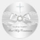 Erste Heilige Kommunion Sticker. Eleganter Silberdiamantenbogen und hübsche weiße Spitze. Bitte beachten Sie: Alle flachen Bilder haben keine echten Bögen oder Juwelen!
