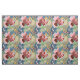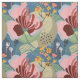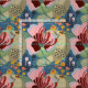 Ein gewagtes, abstraktes Blumenmuster in hellen Farbtönen wie Blau, Grün, Gold und Bordeaux.
