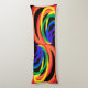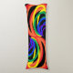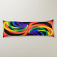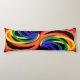 Dieses wunderschöne Kissen weist ein abstraktes dreidimensionales Muster von Regenbogenhalbmonden in fett roten, orangefarbenen, gelben, grünen, blauen und lila Farbtönen auf schwarzem Hintergrund auf.