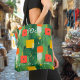 Dieses lebhafte Tote-Taschendesign zeichnet sich durch fette geometrische Formen in den roten, gelben, grünen und orangefarbenen Quadraten aus. Das Set vor einem strukturierten grünen Hintergrund. Ideal für diejenigen, die moderne, abstrakte Kunst Liebe und woll, einen farbenfrohen Pop in ihren Alltag. Ideal für Kunstliebhaber, Studenten und alle, die einzigartige, auffällige Designs schätzen.
