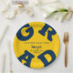 GRAD in fett blauen Schriftzeichen um die Ränder dieser gelben Graduierungsparty-Teller - erhältlich in 2 Größen. Herzlichen Glückwunsch über den Namen Ihres Absolventen und die Klasse von unten. Die perfekte Ergänzung zur Tischdekoration für kommende Partys. **TIPP: Klicken Sie auf "CUSTOMIZE", klicken Sie auf "COLOR" rechts oben; geben Sie Ihren Farbhex-Code in das Feld #xxxxxx ein, um Ihren Schulfarben zu entsprechen. SIEHE GANZE SAMMLUNG von vorgefertigten Farbkombinationen und mehr in unserem Shop.