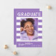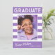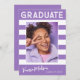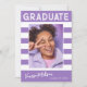 Trendige, fett gestreifte, Retro-Abschluss-Ankündigungskarten mit Designelementen aus Retrotext mit Handschrift. Das Foto der Absolventen ist mit fett weißen Streifen betont. Auf der Kartenrückseite finden Sie personalisierte Textstellen für Informationen über Ihren Abschluss und Ihre zukünftige Reise. Weiße Schrift auf elegantem Violett oder einfach anpassen Sie den Hintergrund, um die Grundfarbe Ihrer Schule oder eine beliebige Farbe Ihrer Wahl. Perfekt für die Highschool, Uni und den Universitätsabschluss.