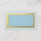 (HINWEIS: Dies ist keine echte Goldfolie, sondern ein gedrucktes Bild).Eine raffinierte Visitenkartenvorlage mit goldener "Folie" und subtilen Zickzack Rahmen und hellblauem Hintergrund. Weißer Text. Die Hintergrundfarbe (blau) ist anpassbar. Klicken Sie auf "Anpassen" und verwenden Sie die Uhren auf der rechten Seite, um die Hintergrundfarbe zu ändern. Das Augenseilwerkzeug gibt Ihnen noch mehr Armbanduhren, und die "erweiterte" Verbindung öffnet das gesamte Spektrum. Sie können auch einen Hex-Wert kopieren und einfügen, wenn Sie einen haben. Ideal für die Mode- und Geschmacksbranche, Veranstaltungsplaner, Innenarchitekten, Friseur-Stylisten, Make-up-Künstler und vieles mehr. Bitte kontaktieren Sie mich, wenn Sie einen passenden Visitenkarteninhaber haben möchten