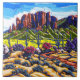 Östlich von Phoenix Arizona finden Sie die atemberaubenden Superstitions-Berge. Dieser Bereich ist Zuhause zu vielen denkwürdigen Plätzen, einschließlich verlorenen Holländer-Staatspark und die unzähligen landschaftlichen wandernden diese Spuren blüht schön im Frühjahr. Diese dekorative Fliese kennzeichnet die Malerei "Aberglaube-Majestät Neils Myers."