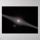 Der Blick aus der Nähe eines hypothetischen terrestrischen Planeten und Mond, der einen roten Zwergstern umkreist, der von Künstlern dargestellt wird.