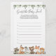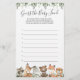 Woodland Tiere Thema Babydusche Vermutung der Baby-Food-Spielkarte bietet eine Aquarell Safari Tier Illustration und Aquarell Grüne eucalyptus Garland und elegante handgeschriebene Stil Schriftart.