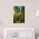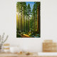 Tief im Wald finden Sie viele Bäume, klaren Himmel und die Sonne scheint durch die Bäume. Das ist eine künstlerische KI.