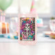 Lebhaftes, farbenfrohes Design mit einer lustigen Tarot-Karte mit einem Skelett. Das Skelett hat wild rosa Haare mit Blume darin, ein Zuckerschädelgesicht und hält ein offenes Buch. Der farbige Text lautet: "Der Bücherwurm". Dieses Design ist auf einer Vielzahl von Produkten erhältlich.