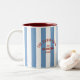 Die Cabin Crew Custom Wappen Blue Park Stripe Zwei-Tone-Kaffee-Tasse bringt rustikalen Charme und personalisierten Stil in Ihre Morgenroutine. Die rosafarbene Keramik-Tasse verbindet eine knallige, weiße Fassade mit rblauen Streifen und einem kontrastierenden bordeauxroten Interieur mit einem nach Maß anpassbaren Wappen. Ideal zum Kaffee-, Tee- oder Kakaotrinken in der Hütte oder Lodge, es ist eine funktionale und stilvolle Art, Ihren Cabin Club Stolz zu präsentieren.