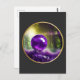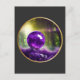 Die Postcard bietet eine wunderschöne künstlerisch-künstlerische Fantasy-Kunst einer magisch-mystischen Amethystkristall-Orb, die in einem Wald schwimmt. Runde Grafik mit goldenem Rand auf schwarzem Hintergrund.