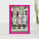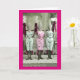 Spaß Vintages Foto mit drei Frauen in Kostüm. Eine trägt blau, eine andere rosa und eine dritte grün. Alle haben Polka-Punkte, die Domino-Stücke sowohl auf ihren Kostümen als auch auf einem gerippten Poster auf einem Pol darstellen