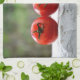Drei rote Tomaten auf einer weißen Mauer vor Grüner Natur