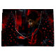 Die dunkle Weihnachtszeit. Weihnachtself im Schatten der gotischen Weihnachtsnachtsnacht, deren spitze Ohren aus seinem schimmernden Mund hervorragen, wie die zarten Blätter eines alten Baumes, steht in der dunklen Dämmerung einer gotischen Kathedrale, wo Schatten und Licht in einem ewigen Tanz verwoben sind. Ein Weihnachtsbaum mit roten Ornamenten erhebt sich majestätisch im Hintergrund