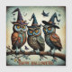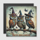 Beängstigend, aber niedlich. Ein Trio von Eulen mit Hexenhüten; surrealer Stil, ein künstlich Intelligenz generiertes Kunstwerk, auf einer Magnetkarte zum Halloween-Vergnügen. Also saisonbedingt! So stilvoll auf Ihrem Kühlschrank!