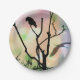 Einsame Krähe auf einem Zweig in der Silhouette gegen einen sonnenunterlassenen, bunten Bokeh-Himmel, wie ein großer Blauer Held wegfliegt... Hergestellt durch die Kombination von 2 Fotos, die ich zusammen und einige bunte Bearbeitung