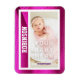 Erinnern Sie sich an die Geburt Ihres wunderschönen Babys, indem Sie ihn auf ihrer ersten Baseballkarte verewigen. Fügen Sie einfach das Foto Ihres Babys hinzu und bearbeiten Sie den Vor- und Vornamen sowie den Teamnamen, der zufällig auch der Nachname der Familie ist. Der Rand der Magnetkarte ist ein rosa Mesh-Bild, das häufig für Sportuniformen verwendet wird.