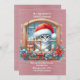 Ein niedliches Kätzchen, das aus einem zu Weihnachten dekorierten Fenster schaut, mit einer Nachricht von Mama & Papa. Auch auf der Rückseite der Karte wird eine Meldung angezeigt. Hintergrund ist ein glänzend rosa Papier