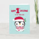 Schick deinen Weihnachtswunsch an deinen lieben Sohn mit dieser Karte eines bezaubernden kleinen Pinguins, der einen Weihnachtsmann trägt, zusammen mit einem Fahrrad und Windeln für seine ersten Weihnachten. © Ness Nordberg