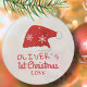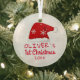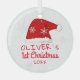 Die erste Weihnachtsfeier des Babys mit Snowflakes Glass Ornament. Niedliches Baby First Christmas Design mit einer Weihnachtsmannmütze, Schneeflocken und einem Babynamen und Geburtsjahr in einem roten Drehbuch. Schaffen Sie sich Ihren eigenen Weihnachtskuchen.