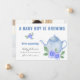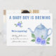 Sagen wir, wir erwarten! mit einer niedlichen Foto Schwangerschaftsankündigungskarte. Ein Baby Boy is Brewing wird in der Schlagzeilen-Typografie mit Ihrer Baby due Date-Nachricht in lässiger handgeschriebener Schrift geschrieben. Die Fotovorlage ist für Sie ein Set, um ein komplettes Blutbild auf der Rückseite mit Ihrem Schild und Ihren Namen hinzuzufügen. Das Design ist mit einem niedlichen Aquarellteppich und blauen Blumen gestaltet.