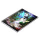 Eine zauberhafte Szene einer Fee in der Nacht, die am Rande eines Waldpools sitzt. Sie hält ein hell erleuchtetes Feuerwerk in den Händen in einer verzauberten Waldglasde und ist umgeben von Zaubern, Licht und Laternen, die von Bäumen hängen.
