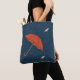 Eine minimalistische digitale Illustration eines roten Regenschirms, der im Wind gefangen ist und über einen marineblauen, blauen Himmel schwebt. Subtile Federn und Windlinien verstärken die Bewegung und schaffen ein poetisches und beruhigendes Design - perfekt für alle bedruckten Taschen, die sich sowohl künstlerisch als auch emotional fühlen.