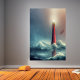 Ein roter Leuchtturm beleuchtet mit seinem Licht im Sturm und Regen, die den kleinen Felsen überschwemmt haben, auf dem er stehend war. Das ist eine künstlerische KI.