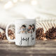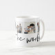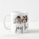 Modernes und festliches Tasse-Design mit fünf quadratischen Fotos, die nebeneinander angeordnet sind, und "Freude an der Welt" in schicken handgeschriebenen Schriften.