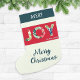 Ein stylischer Strumpf mit "Joy to the world"-Wörtern in der Mitte, mit dem Wort "Joy" gefüllt mit einem botanisch-grünen Blatt und roten poinsettia Blume Design. Hier unten ist der Gruß 'Frohe Weihnachten' in festlicher Schrift Typografie. Der Strumpf kann oben mit einem Namen auf der grünen Leiste personalisiert werden.