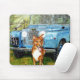 Wenig blaues 80" Series1 Geländewagen, der durch ein altes hölzernes Tor mit Sandy Sam der Grenzcolliehund geparkt wurde, wartete den Befehl des Bauern (seine Meister). Die Freunde des Bauern ist Tischplattenfirma für Bildschirm und Maus und besonders für Geländewagen-Enthusiasten.