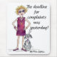 Wenn wir das hören, sind wir ebenso überrascht wie das Poodle. Eine Frist für Beschwerden? Nun, ich kann es akzeptieren, von so einer hübsch aussehenden Lady zu kommen. Ich skizzierte ihr, wie sie die Leitung innehat, in einem roten Kleid gekleidet, ihr goldenes Haar und ihre Brille ergänzen das Aussehen der Zuversicht. Am besten gehe ich weiter und vermeide die Konfrontation.