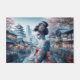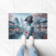 Eine wunderschöne, traditionelle Geisha, die vor einer Landschaft steht, die traditionelle und moderne Gebäude miteinander verbindet.