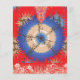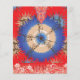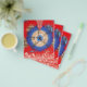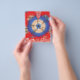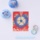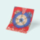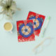 Das Design weist ein atemberaubendes Fraktal-Muster auf. In der Mitte befindet sich ein kreisförmiges Motiv in Blau und Weiß, umgeben von aufwändigen Designs in Orange-, Braun- und Blautönen. Der Hintergrund ist reich rot mit goldsternähnlichen Mustern, die überall verstreut sind. Dieses symmetrische Fraktal Design ist visuell faszinierend und symbolisiert oft unendliche Komplexität, sei es in Mathematik, Naturwissenschaft oder Kunst.