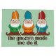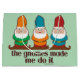 Die Gnomes ließen mich sie tun. 3 verschiedene farbige Gnomes, die heraus hängen. Parodie/Parodie des Teufels ließen mich sie tun. 3 Gnomebilder. Grün-/Türkishintergrund. Völlig kundengerecht.