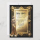 Ein verzierter und dekorativer Deko umrahmt ein goldenes Inlay, auf dem schwarze Vorlagen für Ihre benutzerdefinierte Formulierung erscheinen. Eine schöne Flapper Braut ist in der unteren links Ecke stehend und trägt ein glänzendes goldenes Kleid, das ein opulentes und regales Gefühl hat. Das Design eignet sich für rauschende Zwanziger; 1920er Jahre; großartiger Gatsby; Vintage Kunst Deko themed event oder feiert. Sie eignen sich sowohl für geschäftliche als auch für private Zwecke. Der Rücken ist schlicht schwarz um Mitternacht.