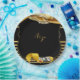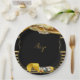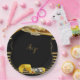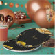 Eine luxuriös schimmernde goldene Seidenstruktur, die durch zwei Hochzeitsringe auf einem dramatischen schwarzen Hintergrund mit einem Deko-Stift gezogen wird, um dem Design einen eleganten und glamourösen Look zu verleihen.