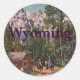 Schönes Vintage-Bild der Grand Teton Bergkette in Wyoming. Schneebedeckte Berge Turm über Cowboys auf Pferden, die sich mit Männern außerhalb einer Blockhütte unterhalten. Sehr Vintager Western!